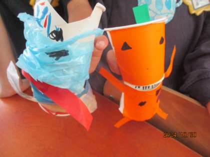 今日、1年生が図工をしました。紙コップを利用して、工作に取り組みました。一人一人が工夫した作品が出来上がりました。