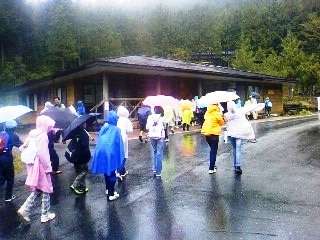 木曽福島の駅から30分ほどバスに乗り,今日の最初の目的地である赤沢自然休養林に到着しました。雨のせいで,今日は,残念ながら遠くの山並みは見えませんでした。