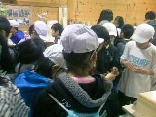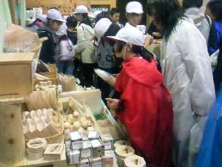 雨の自然林を散策した後,楽しみの一つお土産タイムです。檜で作った工芸品が,やはり,大人気です。コースター,ペンダント,しおり,石鹸,などなど,思い思いの品を手にとって品定めをする子どもたちでした。