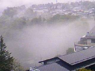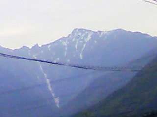 2日目の朝を迎えました。昨日の雨もあがって,今日は,遠くの山の頂を眺めることができ,木曾駒ヶ岳の上には,まだ雪が残っています。朝の木曽川の上には,まだ霧が係っていました。