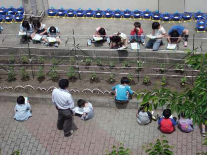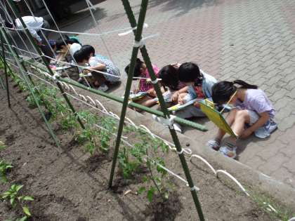 昨日,土橋さんと一緒に植えた夏野菜の観察をしています。世話をして,たくさん収穫できるといいね。
