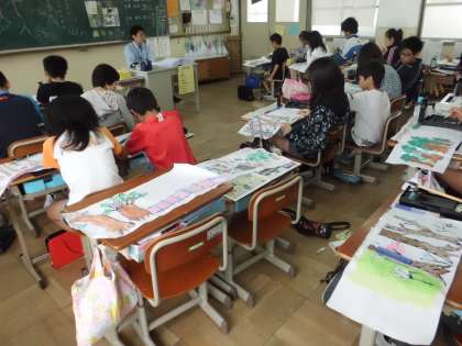 修学旅行の思い出の絵がどんどん出来上がってきています。まだ,俳句が入っていないようです。それぞれの生き先で子どもたちが感じたことが俳句となりますが,出来上がりが楽しみです。