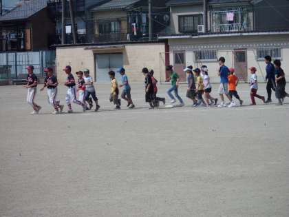 今日はおやじの会主催のキャッチボール大会です。まず,挨拶の後ランニング,体操をしました。待鳳ドラゴンズの皆さんにお手伝いいただいています。
