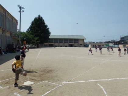 キャッチボールや遠投をしています。ふだん,野球をしていなくても40メートルぼど投げる子もいます。