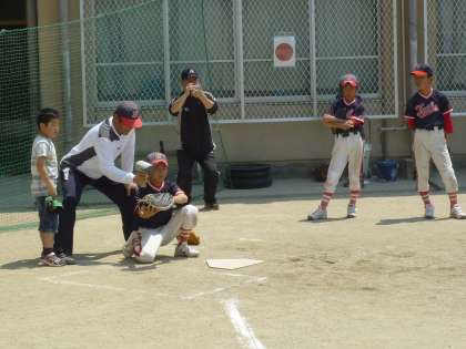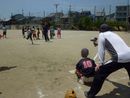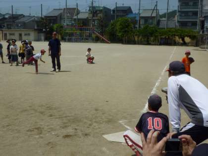 次は,スピードガンコンテストです。ホームベースに向かって投げるボールのスピードを測ってもらいました。男の子にまじって,女の子も負けじと挑戦しています。最高スピードは5年生の子どもで,80Kmを超えるスピードが記録されました。