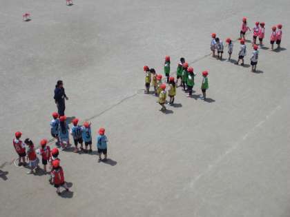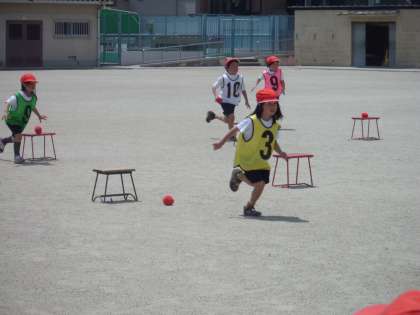 今日はおきかえリレーを楽しんでいます。きちんと台の上に玉を置かなければなりません。あわてて玉を落とすチームも出てきます。しっかりバトンタッチもしてね。