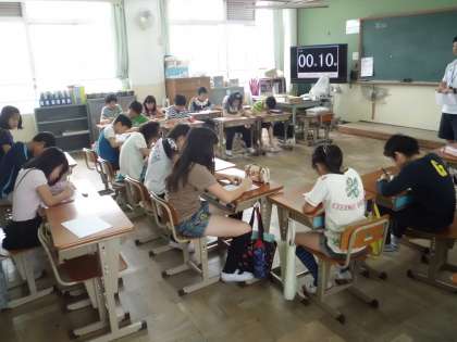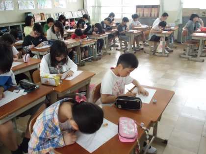 掃除が終わって後片付けのあと,5時間目が始まるまでの10分間,どの学級も計算タイムです。10分の間に問題を解いて答え合わせまでします。みんな真剣に取り組んでいます。