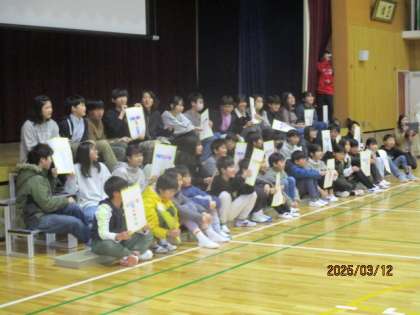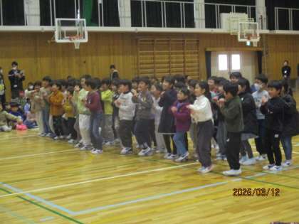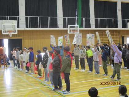 6年生を送る会を今日の3時間目に、全校児童が体育館に集まって行いました。初めに卒業する6年生が体育館に入場した後、1年生から順に各学年がお祝いの出しものをしました。歌ありダンスありエールあり、いろいろな形で6年生の卒業をお祝いしました。みんなの心が一つになってお祝いの気持ちのこもったすばらしい送る会となりました。