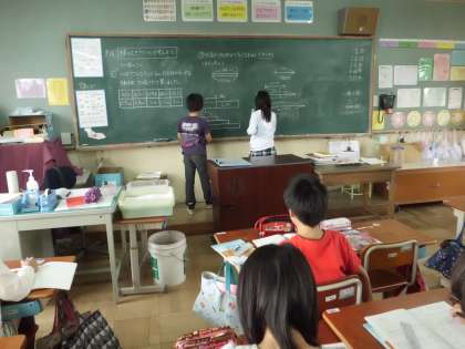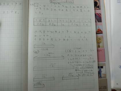 かける数が小数の場合も整数のときと同じように線分図に表せることを確かめ,かける数が小数の場合の計算方法を考えています。