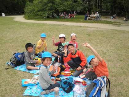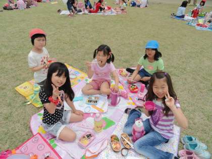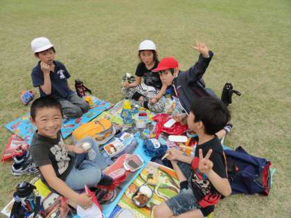 いっぱい遊んでおなかもすいてきました。さあ,お弁当タイムです。みんなおいしくいただいています。植物園のお弁当って最高ですね。