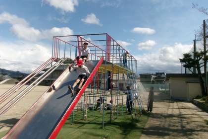 5時間目に、総合遊具の昇り方や築山の使い方について学習する仲よし学級の子供たちの様子を見かけました。安全に気を付けて学習していました。
