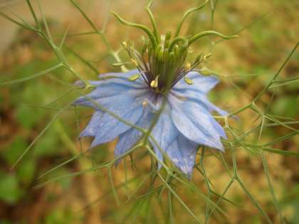 ニゲラの花が咲き始めました。ニゲラというと,何か怪獣の名前みたいですが,草姿も少し変わった形をしており、特に葉に特徴があります。タネが黒いところから,「クロタネソウ(黒種草)」という和名で呼ばれることもあります。