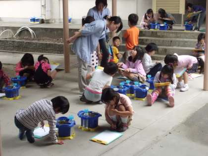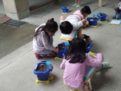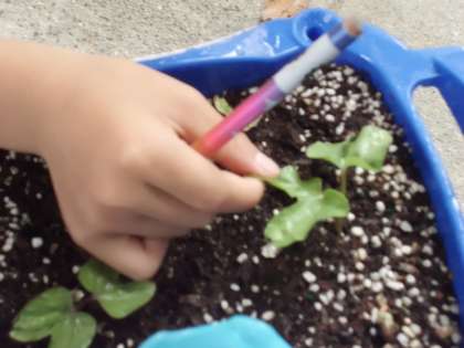 みんなのアサガオにふた葉が出てきました。さっそく観察です。ハートみたいな形やつるつるしてるよと細かいところまで観察しています。