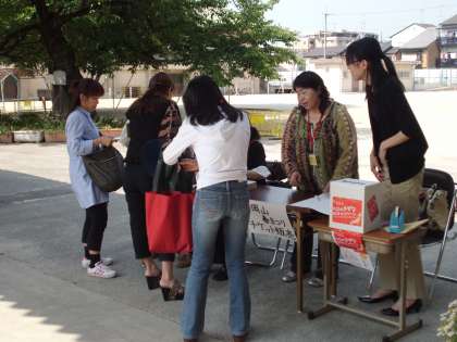 本日の休日参観を利用して,PTAの皆さんが,6月3日(日)に行われる「北区民春まつり」のチケット販売と,日本PTA全国協議会が行っている東日本大震災「心のきずな61キャンペーン」の募金活動を行っています。