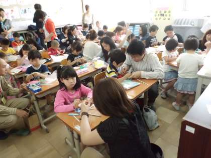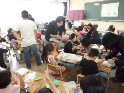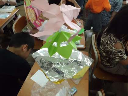 きり方を工夫して出来た飾りをストローと交互に糸に通していきます。だんだんと出来上がっていきます。
