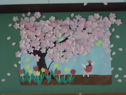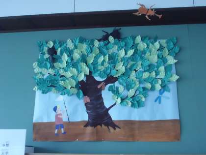 図書室の春・夏・秋・冬の名木100選のソメイヨシノをモチーフにした季節の掲示が子どもが描かれ完成しました。夏には虫たちもいます。