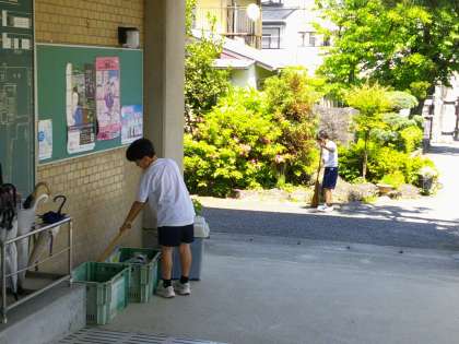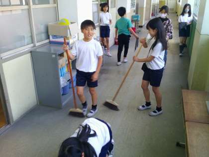 掃除時間には一生懸命、掃除に取り組んでいます。自分たちの教室だけでなく、全校児童が使う場所をきれいにする。みんなのためにきれいにする。その気持ちが大切です。