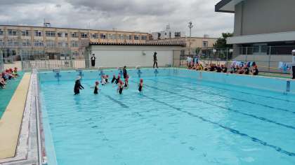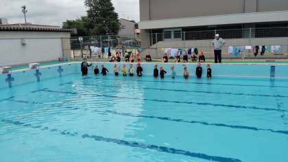 6月17日(月)にプール開き(水慣れ)を実施しました。今日はプールでの決まりについて学んだり、水遊びをしたりして活動を行いました。蒸し暑い中、子どもたちは気持ちよさそうに活動をしていました。