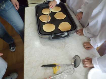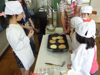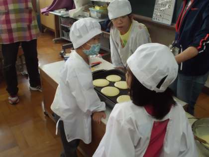 今日と明日が誕生日のお友だちがいます。そこで,今日の5時間目はお誕生日会をすることになりました。ホットケーキを作って食べます。美味しそうなきつね色に仕上がりました。