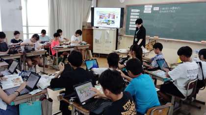 6年生の教室をのぞくと、子どもたちがさっそく新しいiPadを使いながら外国語の学習に取り組んでいました。イヤホンを使ってデジタル教科書の音声を聞きながら、聞き取りの問題に取り組んでいました。