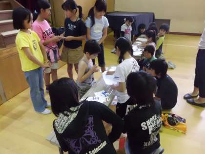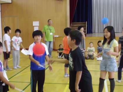 同じく体育館ではツンツンバルーンと言葉パズルが行われています。みんな高得点をねらおうと力を合わせています。