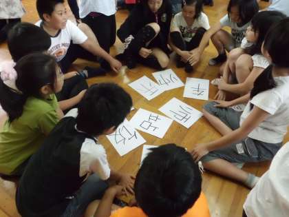 今日は佛教大学西岡ゼミと小大連携の外国語活動です。まずはじめに,外国の文化の触れる学習です。中国からの留学生,王さんと黄さんの自己紹介の後,王さんが中心となって中国で使われている漢字当てクイズを行いました。弐歩で使われている漢字と似ているところがありますね。中国での読み方も教わりました。