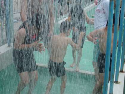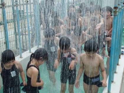 今日は1年生初めての水なれです。足洗い槽を経て腰洗い槽に,みんな,去年の夏以来のプールにキャアー,ワーと,大歓声。シャワーでは,冷たいの声が…。でも,初めての小学校の大きなプールに心がはずんでいます。