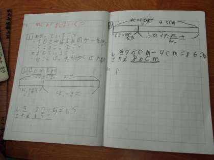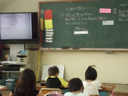 テープ図をかくことを通して数量の関係を把握し,加法の逆思考の問題を考えています。