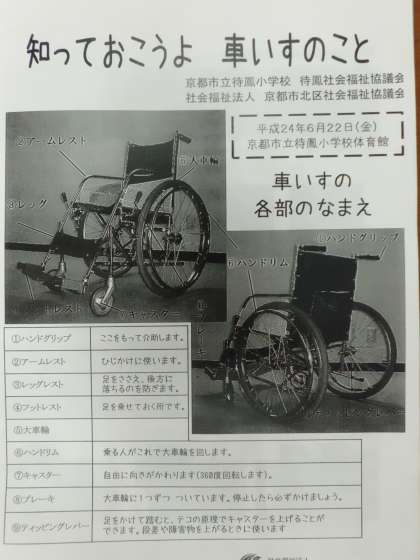 明日は待鳳社会福祉協議会とのコラボレーションスクールの一環として,車いす体験を実施します。今日は,その事前学習をしています。車いすを使わなければならない人の気持ちを考えて体験できるといいですね。待鳳の街の担い手となる子どもたち,誰にもやさしい街,待鳳をみんなの手で継続してほしいと願っています。