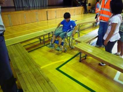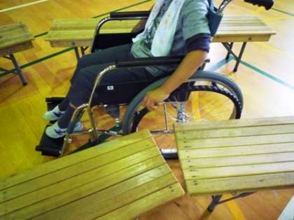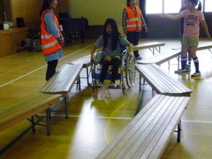 長いすで作られてた狭い道を自力通行しました。スムーズに通ることができた子どももいましたが,長いすに当たってしまう子どももいました。