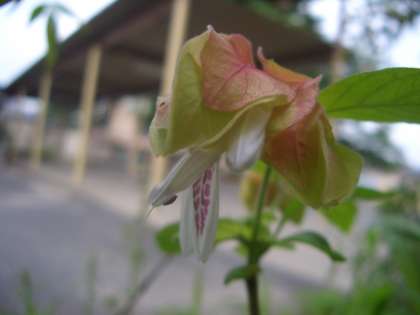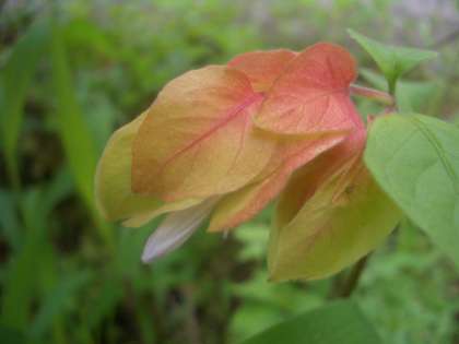コエビソウに白い花が咲きました。下から覗くと,褐色の点々がついた白い花がよく見えます。上になっている方の花びらの先に,二つ黒っぽく見えるおしべの様子がエビの目玉のように見えるからコエビソウというのだという説もあるようです。言われてみれば,そのようにもみえます。花のように見えるのは「苞」です。