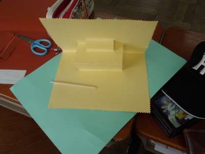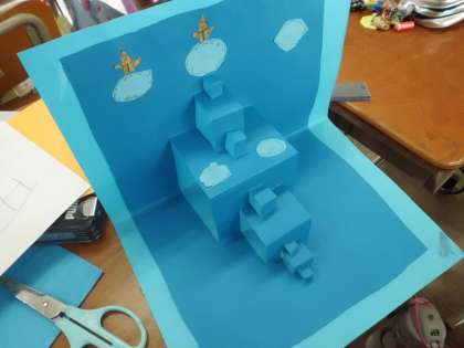 開くと「とび出す」仕組みをつくり,,切ったり折ったりしながら,その特徴を生かした楽しいカードをつくっています。さて,どんなとび出すカードができるか楽しみですね。