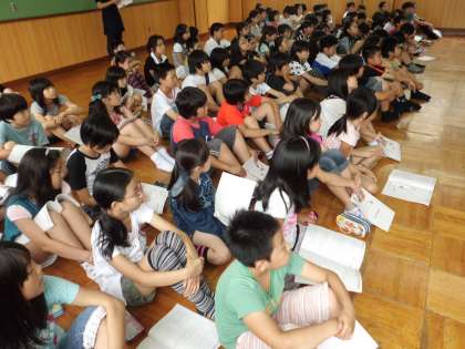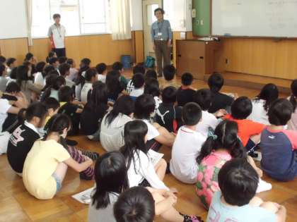 6月29日に行われるスチューデントシティ。各学級で事前学習を進めてきましたが,今日は総まとめとして,学校運営協議会の理事で,実際にスチューデントシティでボランティア活動をされている奥田さんから,お話を聞きました。本番に向けて,もう一度おさらいの意味も込めて,スチューデントシティの学習の流れや,注意しなければならないことを伺いました。