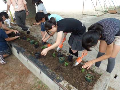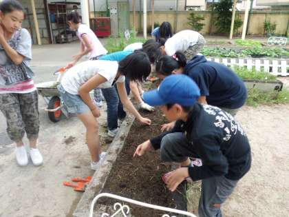 園芸委員会が種から育てた綿や,管理用務員さんが育ててくれたマリーゴールド,ニチニチソウの苗をブランコ周りの花壇を整備して植えました。間もなく花いっぱいになることでしょう。綿は花の色が変化します。ようく観察すると面白いよ。