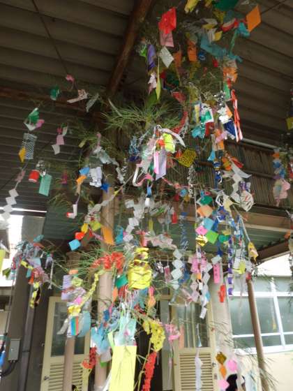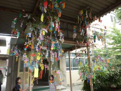 すこやか学級のみなさんと1年生,仲よし学級のお友だちで飾った笹飾りが中庭に建てられました。みんなの願いごとがかないますように。