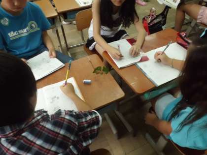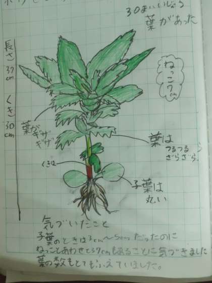植物の作りを観察しています。ホウセンカの他の植物についても調べています。ホウセンカの観察ノート,とてもよく書けていますね。