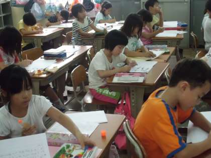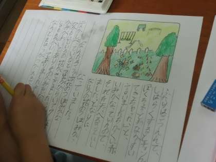 挿絵を見て展開を考え,経験したことや想像したことなどから書くことを決め,まとまりのあるお話を書いています。どんな楽しいお話ができるかな。