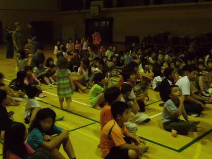 打ち上げ花火の後,体育館で北消防署の方から花火をする時の注意や防火について話を聞いたあと,映画を見ました。花火大会ができず残念でしたが,おみやげとして花火をいただきました。夏休み,花火や火の取り扱いには十分注意して,火事を起こさないようにしましょう。