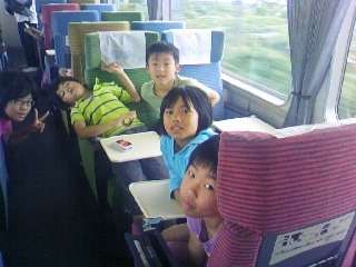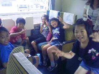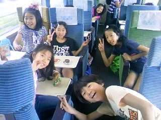 近鉄電車の車内の様子です。グループで、おしゃべりをしたり、ゲームをしたりして楽しく過ごしていました。