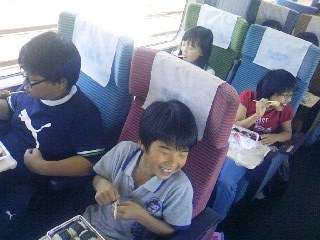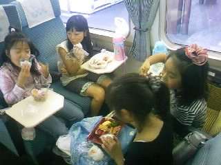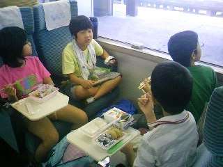 電車は伊勢市あたりを走っています。ここで、少し早いですが、昼食のお弁当をいただきました。お互いの中身を見せ合ったり、中には、おかずを交換したりしている子どもたちもいました。