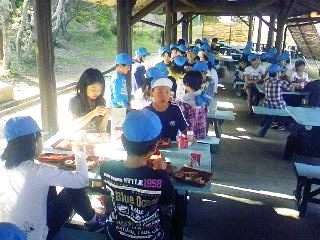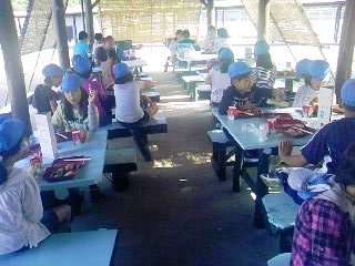 2日目の今日も、とてもいい天気に恵まれ、きれいな青空が広がっています。そんな青空を眺めながら屋外でいただく朝食は、おいしく感じられます。そして、今日は、思いっきり自然の中で楽しく活動しようと思います。