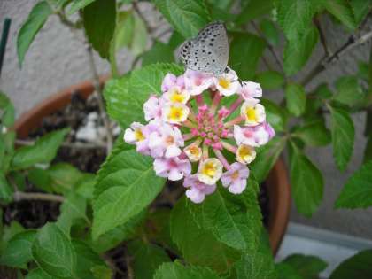 ランタナの花にシジミチョウがとまっています。蜜をすっているのでしょう。シジミチョウの種類は約6000種にも達するそうです。