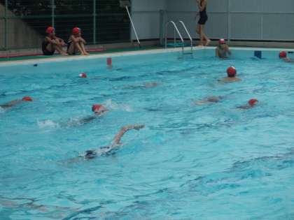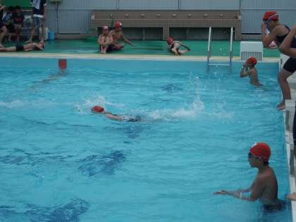 6年生が自分の泳げる距離を伸ばそうと頑張っています。何度もプールを往復すろ子もいます。
