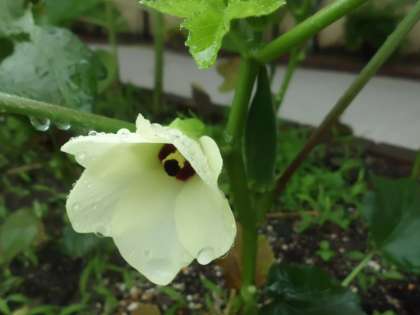 園芸委員会が育てているオクラ,花が咲き実ができています。これから,どんどん実ができてきます。