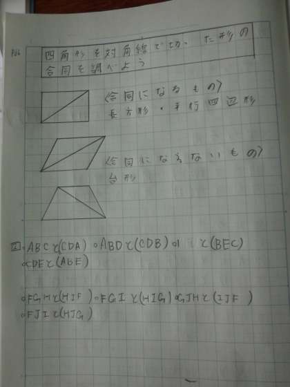 長方形や平行四辺形を2つの対角線で分けた三角形を使って,合同な図形の見付け方を学習しています。