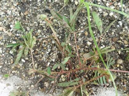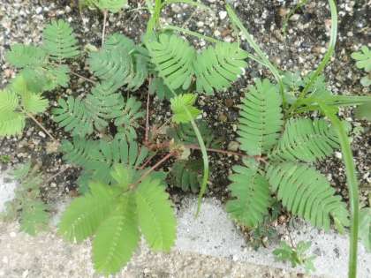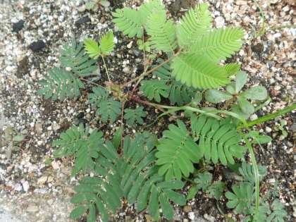 中庭の花壇にオジキソウが顔を出しています。去年,1年生が育てていたものです。本来は多年草ですが,耐寒性が低いため日本の園芸では一年草扱いにすることが多いようです。オジキソウに花が咲くの,知ってますか。ようく観察してみてね。3枚目の写真は2枚目の写真のオジキソウイが葉を閉じたところです。