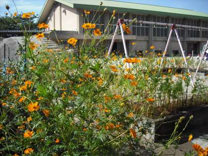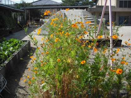 キバナコスモスが満開です。すべてがこぼれ種から発芽したものを植えかえしたものです。