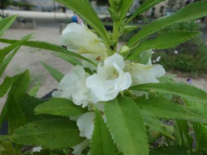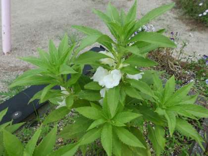 6年生が理科の学習で使うホウセンカ,これは6年生が植えたものではありませんが白い花をつけています。ホウセンカの実は熟すと果皮の内外の細胞の膨圧の差によって弾性の力を蓄積し、弾けて種を遠くに飛ばすことで有名です。良く,待つ休みの自由研究で使われていますね。