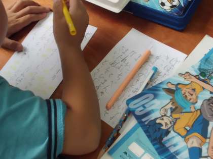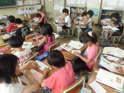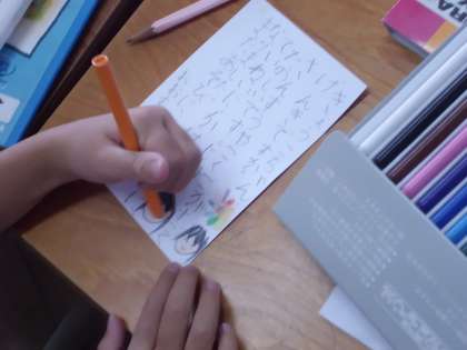 手紙の約束事を見つけ,だれにどんな内容の手紙を書くかを考え,手紙の約束事に沿って,手紙を書いています。絵をかくなど,楽しんで手紙を書いています。