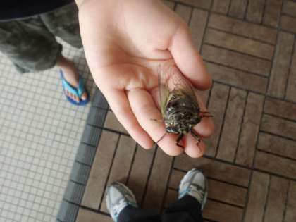 今日から夏休み,今日は猛暑日になりそうですね。朝早くから蝉の声がうるさいくらいです。朝早くから子どもたちが登校しています。陸上の練習,学習相談日に登校してきた子どもたち,さっそく虫取り,蝉を捕まえて見せに来てくれました。